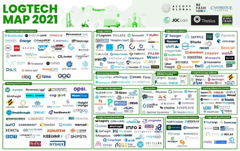 We’ve got a big update on our 2021 LogTech Map, releasing version 2.0 earlier today. This is an open, iterative process, and we never set out to create a perfect map, because that doesn’t exist. We wanted to create the most accurate, most useful map out there, and we’re progressing toward that goal. We know where this can be improved in future iterations and that the makeup of this map will change weekly based on funding rounds, M&A and new entrants on the scene (not to mention more representation from companies in emerging markets). A huge thanks to Radu Palamariu, Brian Laung Aoaeh, Nick Chubb, and Ben Gordon for the countless meetings, phone calls, and Airtable work putting this together. Thanks to Radu’s team at Alcott Global for making this look pretty too.